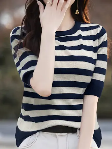 Women's Casual Crew Neck Striped Knit Short Sleeve Top - Navy & White, High Stretch Jersey, All-Season Pullover with Detailed Stitching, Casual Wear|Striped Top|Knit Texture.